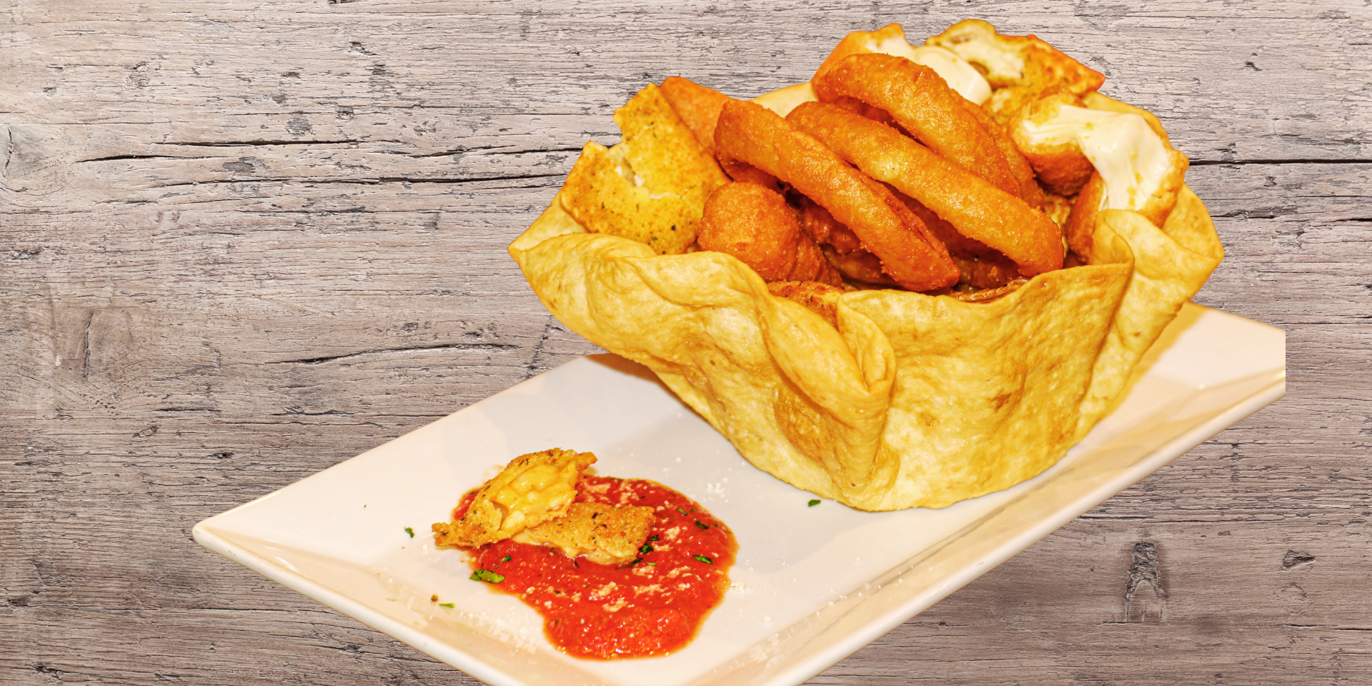 Deep- fried mozzarella bites, toasted Jalapeño ravioli, cheese ravioli, onion rings and Vinny’s chips, served in a golden-brown bowl made from crispy edible shell with ranch and marinara sauce.