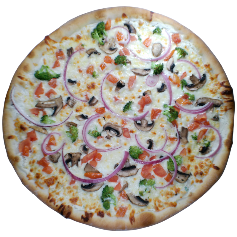 Red onion, mushrooms, broccoli, fresh tomato and mozzarella melted over white sauce.