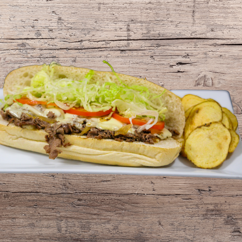 Sliced ribeye, grilled with onions, topped with cheese, lettuce and tomato, nestled in an eight-inch sub roll.