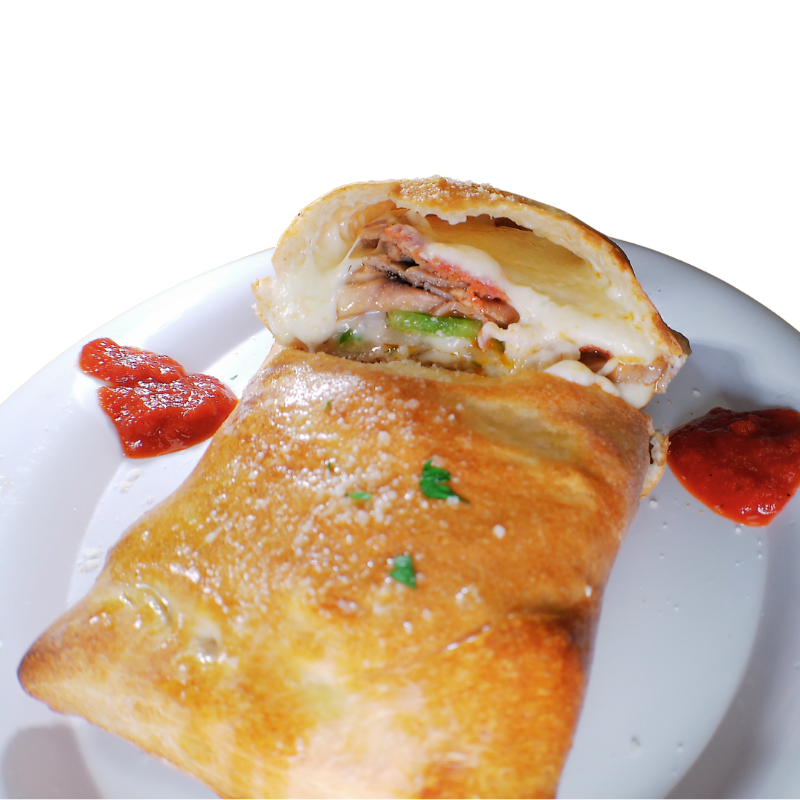 Fresh pizza dough rolled around mozzarella, pepperoni, sausage, ground chuck, green pepper, mushrooms and onions.