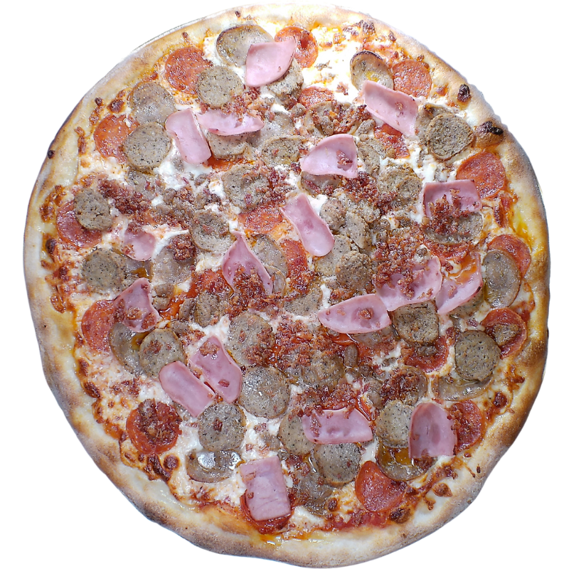 Pepperoni, sausage. Meatball, ground chuck, ham and bacon on a cheese pizza.