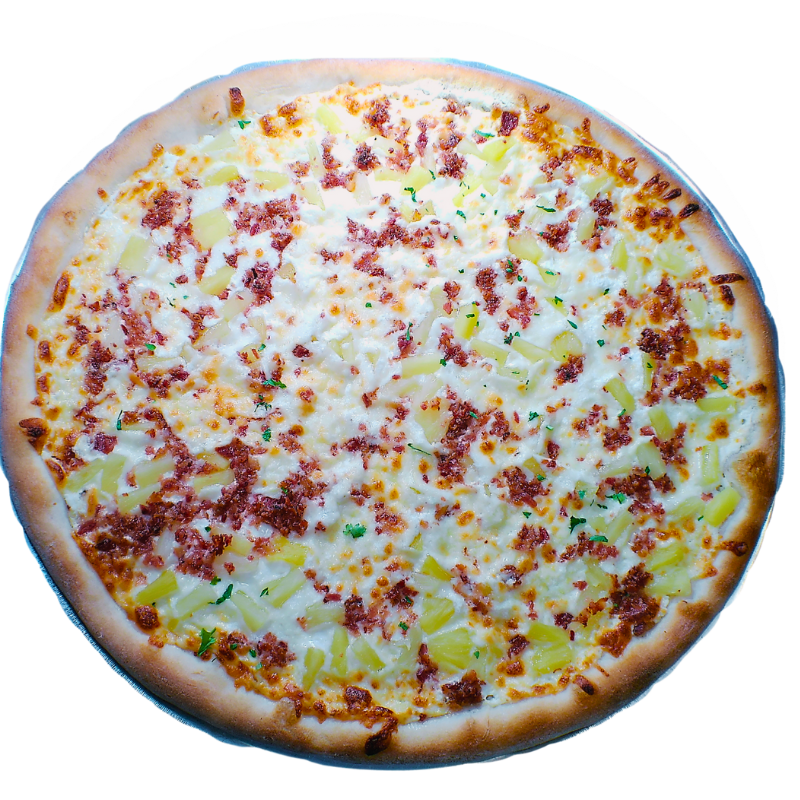 Crisp Bacon, fresh and mozzarella melted over white sauce on a hand-made pizza pie.