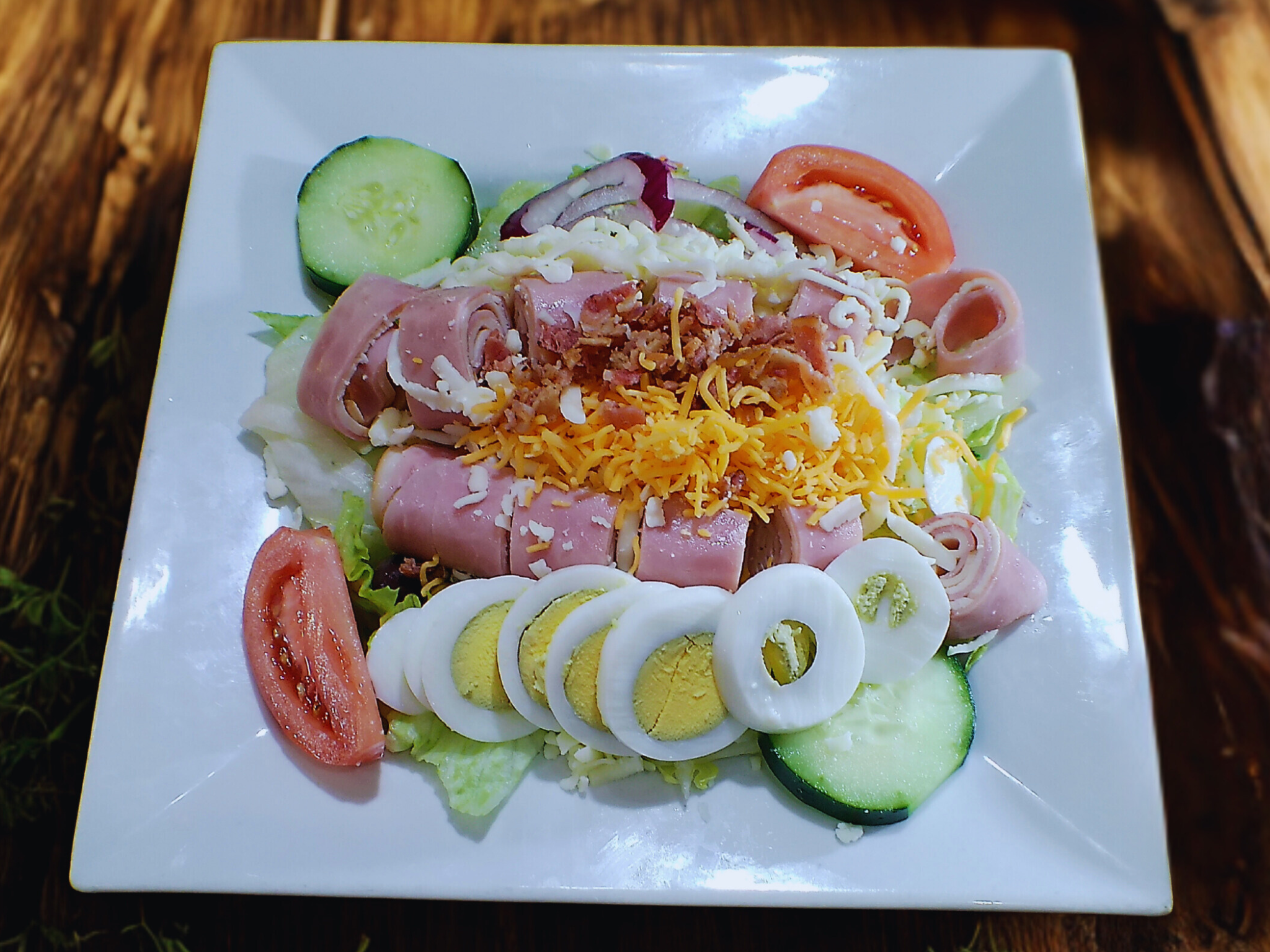 Lean ham and turkey with shredded mozzarella and cheddar cheeses, crisp bacon and hard-boiled egg, served over a bed of our house salad.